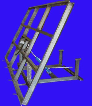 Ezlay hydraulic tilting table. Steel frame with 8-ton hydraulic pneumatic jack no finished top and not painted. If you do marble or granite work the EZLAY can pay for itself with your first job. Have you ever broken a slab laying it down? Never break another one. The EZLAY is constructed of heavy 4" 5.4 channel, mig welded and will last for years. The EZLAY has 1-inch round hinge pins, 1/2 struts rods for extra support, built in stops, and tilts to 85 degrees. Each EZLAY is custom built in a precision jig ensuring high quality. It can be bolted to the floor or just put some weight on the back channel to keep it steady. The top of the table is 10' X 6' and comes with an 8-ton jack with a manual jack handle. That's 16,000 lbs of lifting power. Custom fitted removable 1x1-14gauge supports pins allow full use of work area. Because EZLAY comes unpainted and does not have a finished top you save thousands! Most of my customers use 3/4 plywood with 6" wide strips of 1/2 DoRock or fiber board. This prevents cutting into to 3/4 plywood stopping you from eating up cutting blades and gives a channel for water runoff. Table comes ready to use no assembly required.